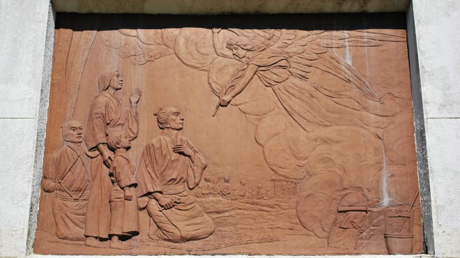 처형 전 최후의 조사를 받는 크리스탄들의 모습이 새겨져 있는 호우코바루순교지,